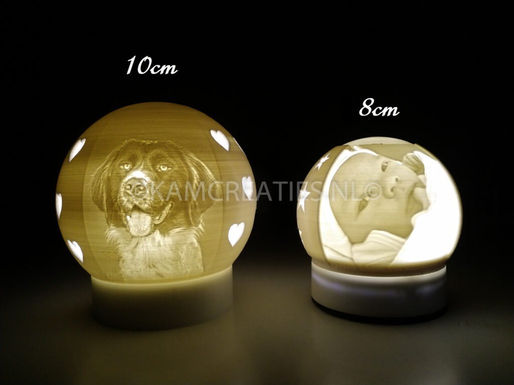Uw foto wordt in de bol zelf ge-3D-print in reliëf, waardoor het mooie effect dus word bereikt. Het is dus geen fotolijstje waar u zelf een foto in hoeft te stoppen.